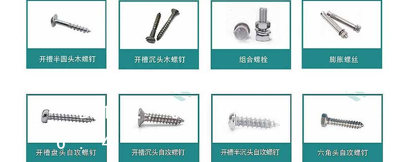 1.機螺釘 2.自攻螺釘 3.鉆尾螺釘 4.墻板釘 5.纖維板釘 6.木螺釘7.六角木螺釘 8.不脫出螺釘 9.組合螺釘 10.微型螺釘 11.家具螺釘 12.電子螺釘 13.鏈帶螺釘頭型 :1.六角頭(hexagon head)2.六角頭法蘭面(hexagon head with flange)3.方頭(square head)4.T形頭T head (hammer head5. B.S.W. 標準惠氏粗牙系列,一般用途圓柱螺紋(英制牙)B.S.F. 標準惠氏細牙系列,一般用途圓柱螺紋 (英制牙)fine pitch thread 細牙full thread 全螺紋 IHH=ind hex head 鋸 六角頭PH=phillips 十字槽Pan 圓頭(盤頭)Oval 半沉頭H.W.H.. 六角小法蘭H.W.F. 六角大法蘭CSK 沙拉頭(沉頭)Large wafer 大